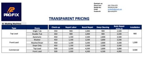 WASHING MACHINE UNIT SERVICE PRICING